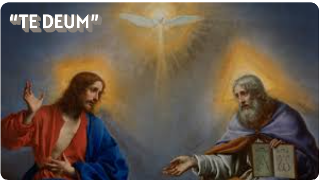 A vós, ó Deus, louvamos. A vós, Senhor, bendizemos. A vós, eterno Pai, adora toda a terra. A vós os anjos, a vós os céus e todas as potestades, a vós os querubins e serafins aclamam sem cessar: “Santo, Santo, Santo, Senhor Deus do universo. O céu e a terra proclamam a vossa glória”. A vós o glorioso coro dos Apóstolos, a vós a venerável falange dos profetas, a vós o resplandecente exército dos mártires cantam os vossos louvores. A vós por toda a terra vos confessa a santa Igreja Pai de imensa majestade; ao vosso adorável Filho, verdadeiro e único; também ao Espírito Santo Paráclito.